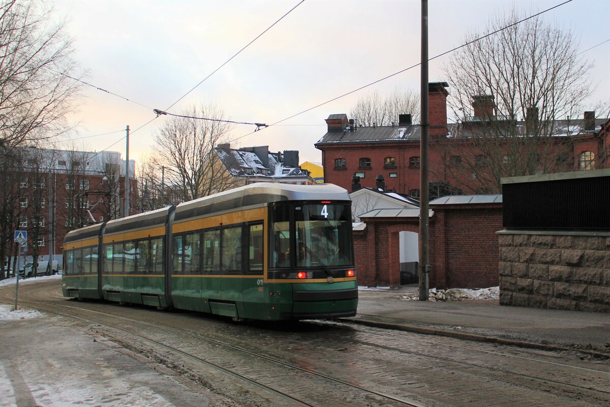 Fahrzeug 465 der HKL/HST vom Typ Skoda-Arctic (Transtech) MLNRV III Tram TW 52 auf der Linie 4 (Munkkiniemi/Munksnäs-Katajanokka/Skatudden). Hier am 31.12.2021 kurz vor dem Erreichen der Haltestelle Vyökatu (Gördelgatan) im Stadtteil Katajanokka. Im Hintergrund das ehemalige Gefängnis von Helsinki, welches heute ein Hotel beherbergt. Markus Klausnitzer