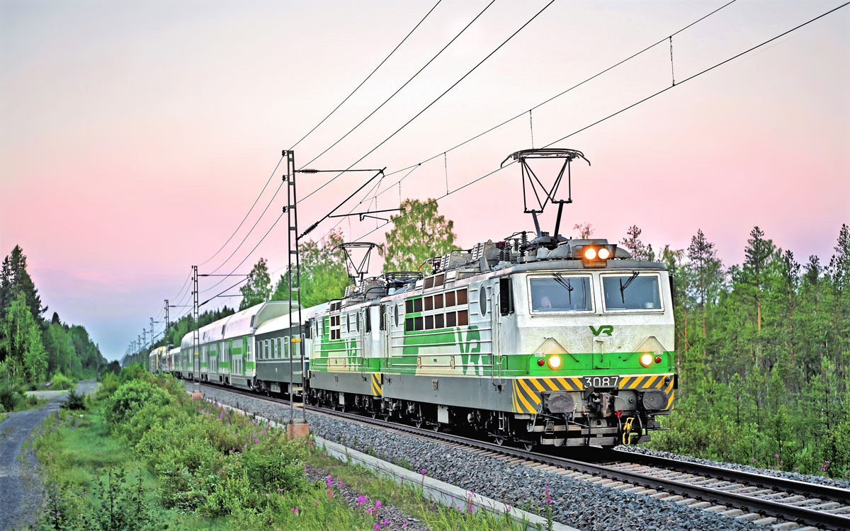Aussergewöhnlicherweise kommt nachts um 03.00 am 10.Juli 2018 der Autotransportnachtzug 265 aus Helsinki nach Rovaniemi in Doppeltraktion mit den Loks Sr1 3087/3033 in Ilveskylä nordwärts vorüber. Matti Morelli