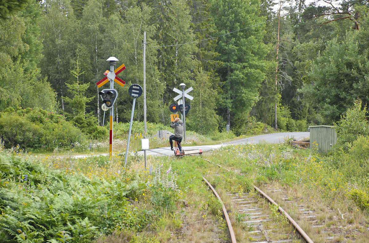 Die Kreuzung mit der Straße G 969 an der Schmalspurstrecke Åseda - Hirserum. Der Draisinenfahrer hat mit Handzeichen anzuzeigen, dass er die Straße überqueren will. Die Draisine ist unter Beachtung des Straßenverkehrs zügig über die Kreuzung zu schieben.