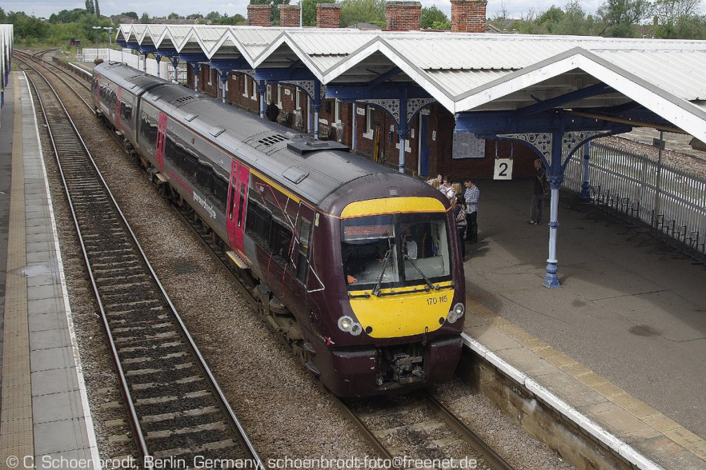 Arriva Cross Country Triebzug 170115 mit dem 12:34 nach Stansted Airport am Bahnsteig in March. 27. August 2010