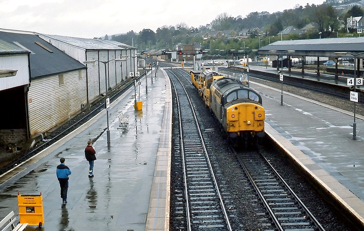 Eine Class 37 der BR durchfährt im April 1992 den Bahnhof Exeter St. Davids. Die jungen Herren links im Bild sind Trainspotter, ihnen geht es nicht ums Fotografieren, sondern sie sammeln Loknummern.
