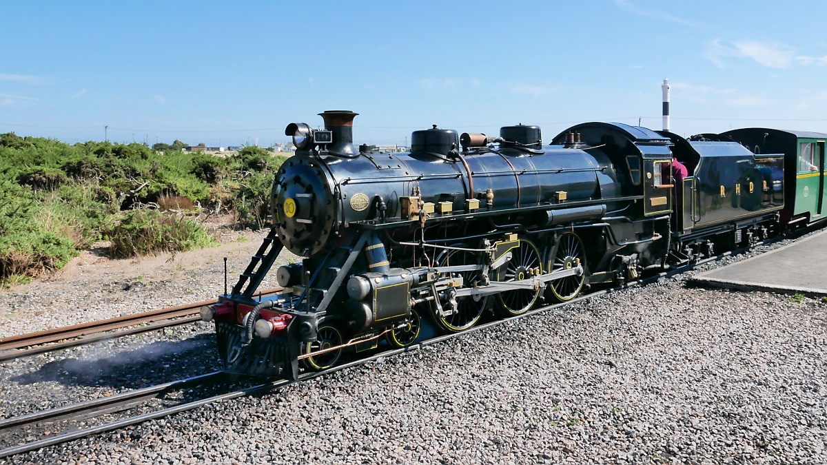 Romney, Hythe and Dymchurch Railway Lok 9  Winston Churchill  erreicht die Endschleife Dungeness. Diese Bahn mit 22 Kilometern Länge auf 381mm Spur ist keine Parkeisenbahn! Neben Touristen und Badegästen hat die Bahn auch lokale Bedeutung, bis 2015 gab es planmäßige Schülerzüge.