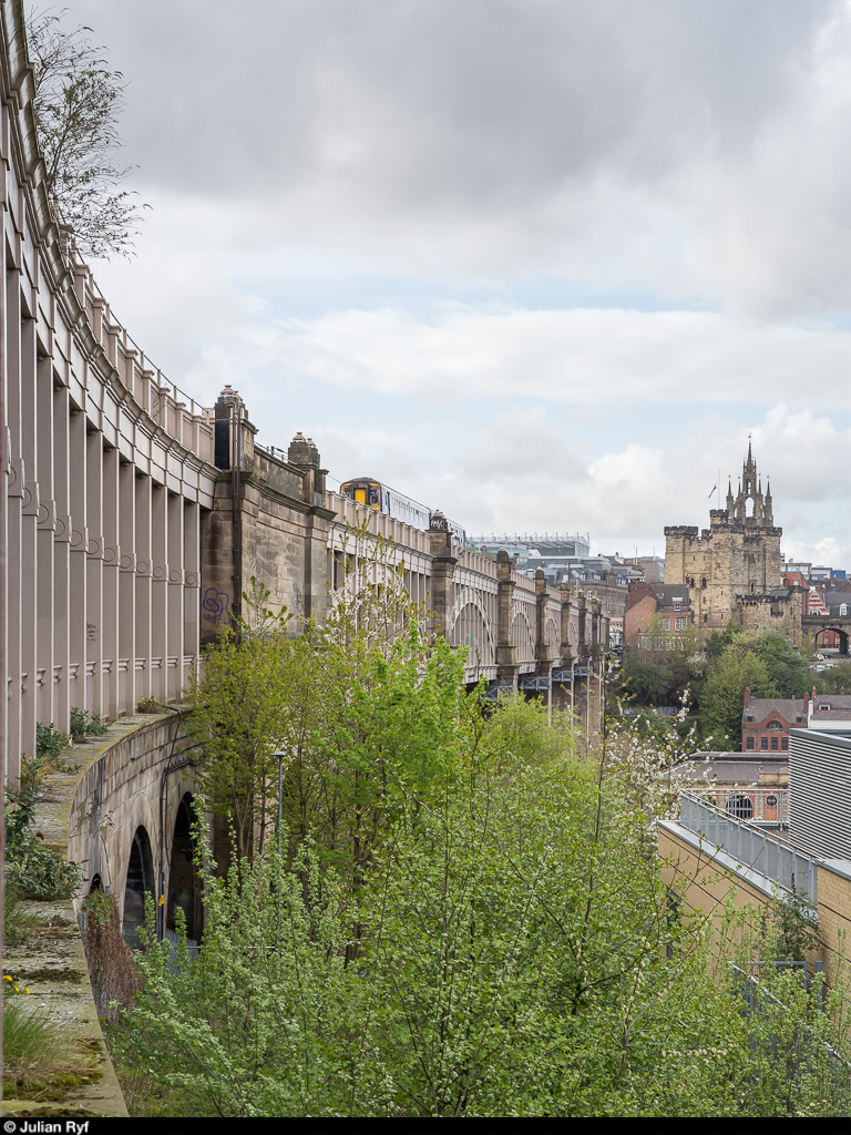 Northern Class 156 überquert am 27. April 2019 die von Robert Stephenson erbaute High Level Bridge in Newcastle. Im Hintergrund Newcastle Castle.