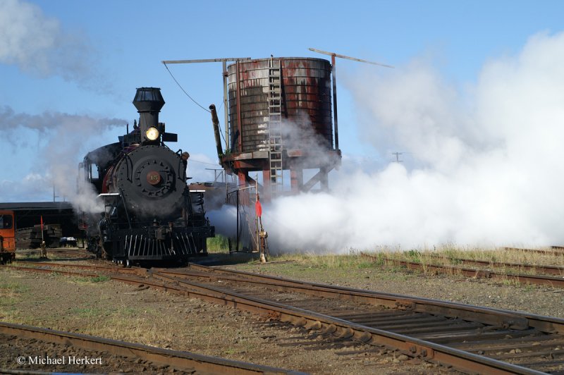 Lok Nr. 45 der California Western bei der Ausfahrt aus dem Depot von Fort Bragg, Kalifornien, Mai 2005