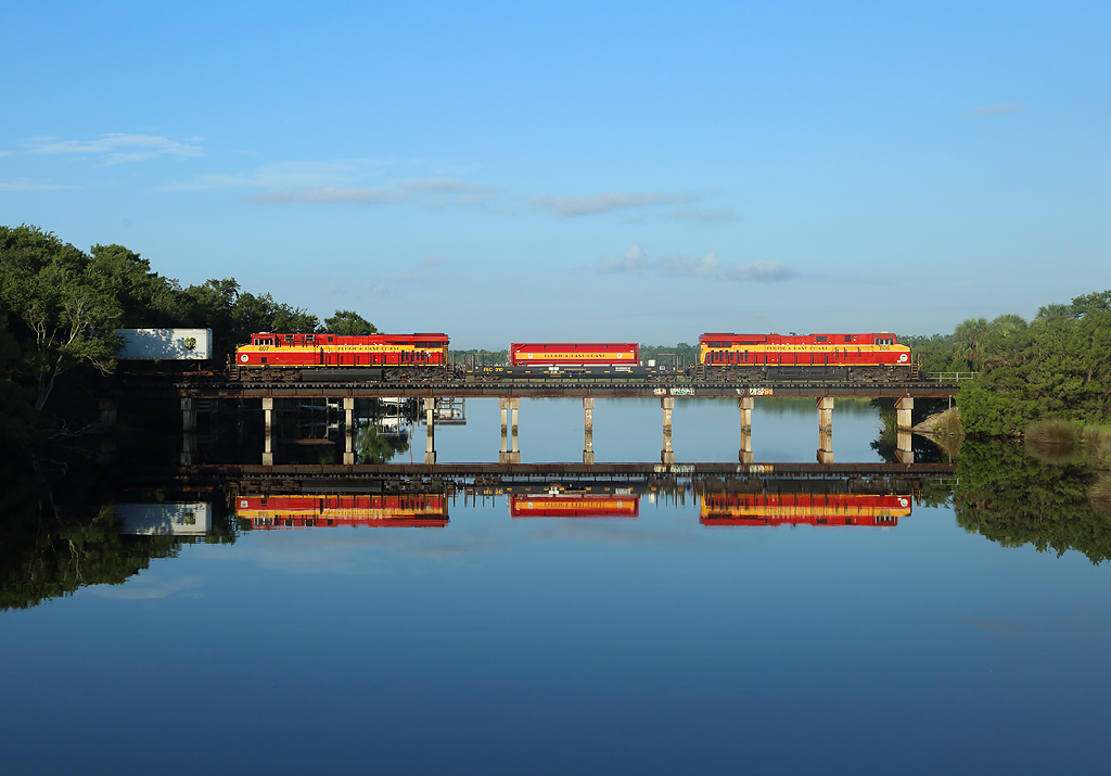 806 & 807 cross the Tomoka River at Ormond Beach whilst hauling FEC226-02, 2300 Miami Hialeah - Jacksonville Bowden, 3 July 2018
