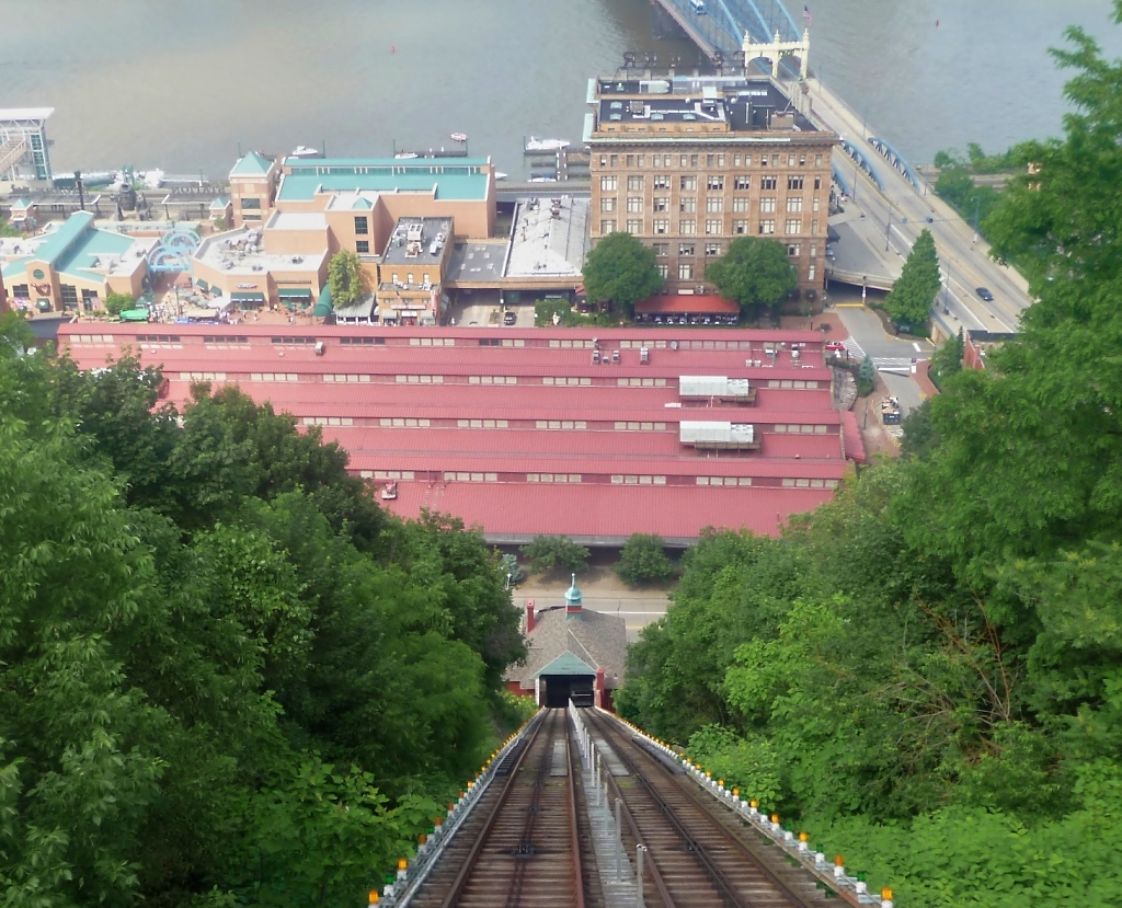 Blick von der Bergstation auf die Trasse der Monongahela Incline, Pittsburg, PA (7.6.09). Es gab früher einmal siebzehn Schrägseilbahnen, die höher gelegene Stadtteile mit der Innenstadt verbanden. Zwei sind noch heute in Betrieb.