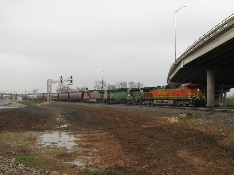 Die BNSF Loks 4884 (Dash 9), 6704 (SD40-2, mit Burlington Northern Lackierung) und 873 (Dash 9, mit Santa Fe Lackierung) ziehen am 15.2.2008 einen Güterzug. Aufgenommen bei starken Regen in Houston (Texas).