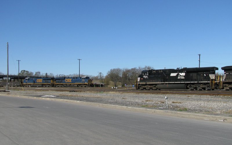 Ein Güterzug mit zwei CSX Loks und ein Güterzug der NS (Norfolk Southern) begegnen sich am 1.1.2008 in Houston (Texas).