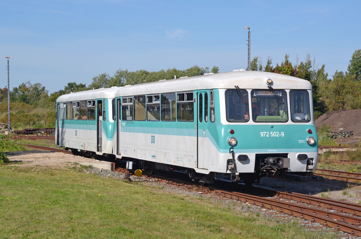 972 502 war während des Bahnbetriebswerkfestes in Wittenberg zusammen mit ihrem Triebwagen der Reihe 772 für den Pendelverkehr zwischen Hbf und Bw zuständig. Am 20.09.25 wartet das Duo im Bahnbetriebswerk noch auf Fahrgäste.