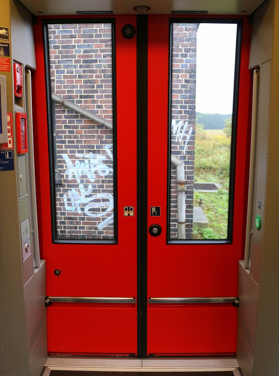 Blick auf einen Türbereich in 1442 173/673 (Bombardier Talent 2) der S-Bahn Mitteldeutschland (MDSB II | DB Regio Südost), der im ehemaligen Bw Lutherstadt Wittenberg anlässlich der jährlichen Bahnaktionstage steht. [24.9.2017 | 14:06 Uhr]