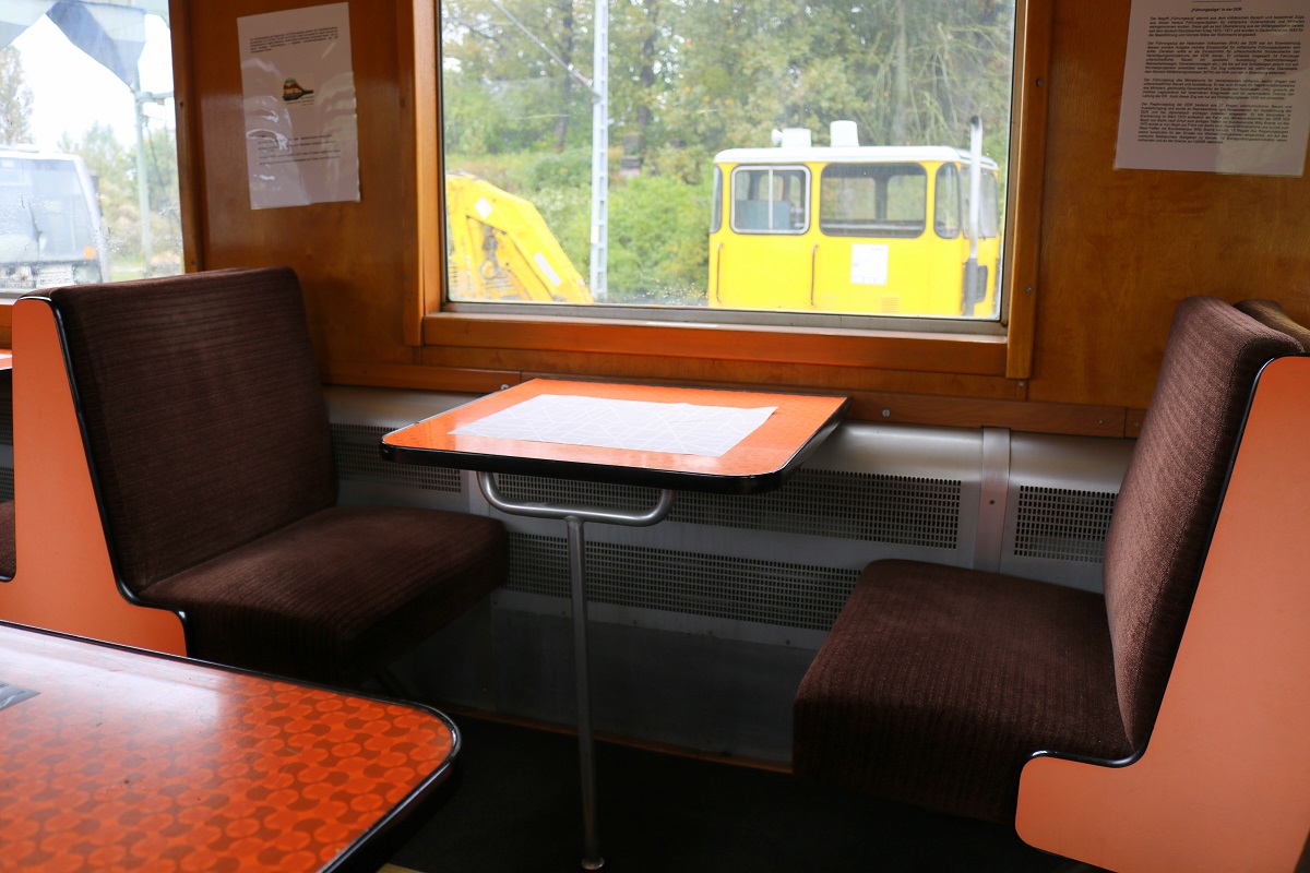 Blick auf eine Zweier-Sitzgruppe im Altbau-Salonspeisewagen 60 50 88 40 052-4 des Regierungszuges der DDR (urspr. Mitropa-Speisewagen), der im ehemaligen Bw Lutherstadt Wittenberg anlässlich der jährlichen Bahnaktionstage steht. [24.9.2017 | 14:13 Uhr]