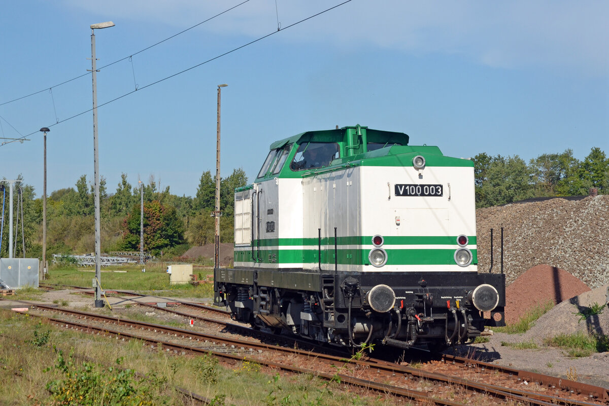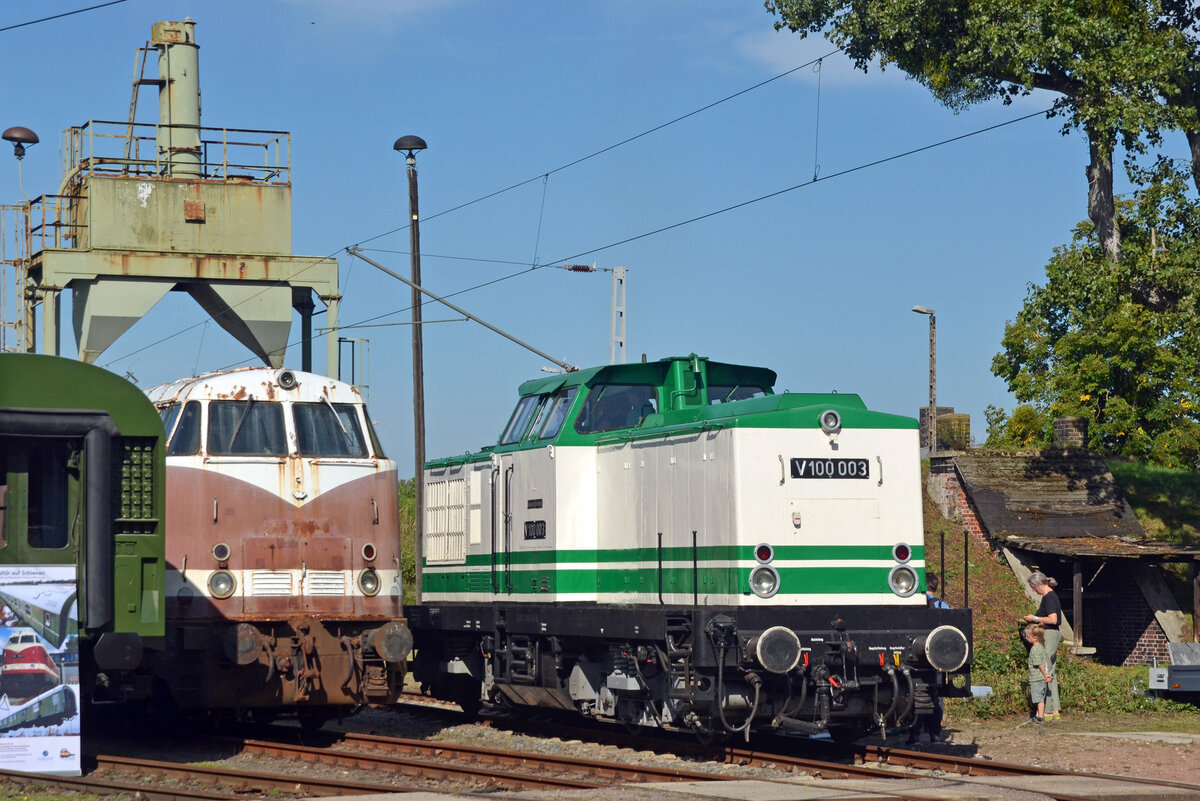 Zum Bahnbetriebswerksfest in Wittenberg-Altstadt wurden auf V 100 003 Führerstandsmitfahrten angeboten. Hier wartet sie am 20.09.25 auf die Abfahrt.