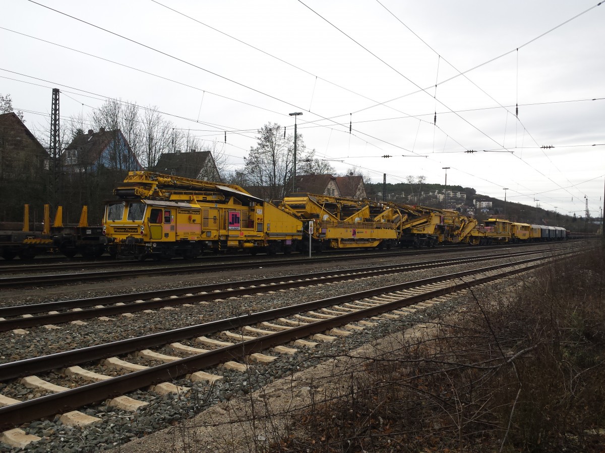 Blick auf die Bettungsreinigungsmaschine RM 80-92 (99 80 9425 037-5 D-ERD) der Eiffage Rail Niederlassung der Eiffage Infra-Bau SE, die in einem Bauzug mit 218 469-5 "Betty Boom" der Railsystems RP GmbH eingereiht ist und, von Naumburg(Saale)Hbf kommend, in Großkorbetha auf der Bahnstrecke Halle–Bebra (KBS 580) fährt.