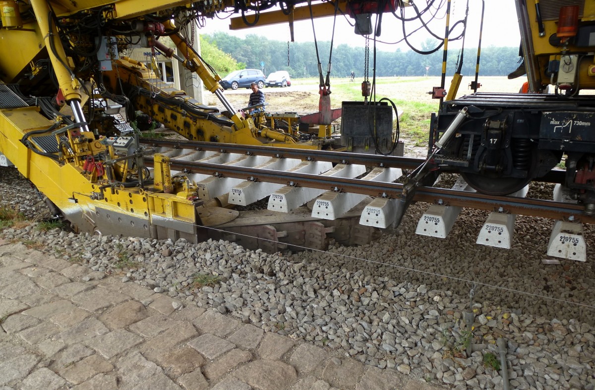 Das Gleis wird hier angehoben, vorne wird mittels Fünffinger-Aushubkette der Schotter ausgehoben und zur Aufbereitung transportiert und der aufgearbeitete Schotter wird dahinter wieder unter das Gleis gebracht.