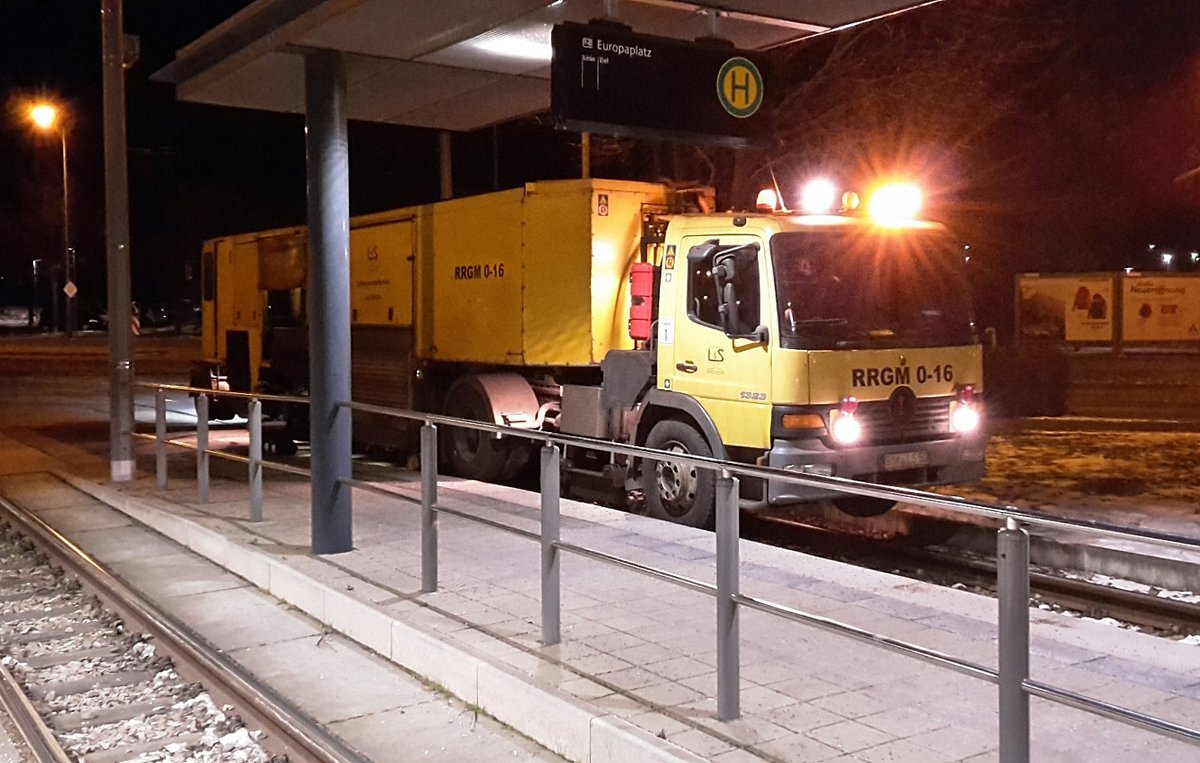 L & S Luddeneit und Scherf GmbH Zweiwege-Schienenschleifmaschine RRGM 0-16 am 19.03.2018 bei Gleisbauarbeiten an der Haltestelle Europaplatz. Frank Thomas