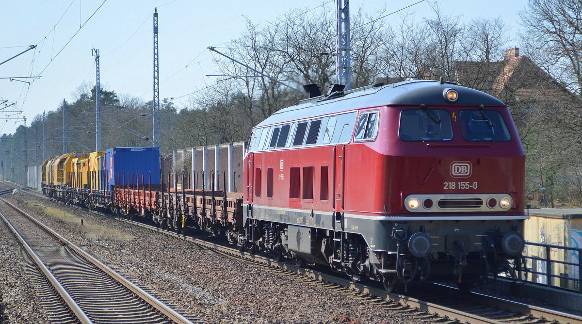 NeSA Eisenbahn-Betriebsgesellschaft Neckar-Schwarzwald-Alb mbH mit der "218 155-0" (NVR: 92 80 1218 155-0 D-NESA) und einem Zug mit Begleitwagen + Schienenschleifzug SPENO INTERNATIONAL Typ RR 16 MS-13 am 26.03.20 Bf. Beelitz-Heilstätten. Lothar Stöckmann