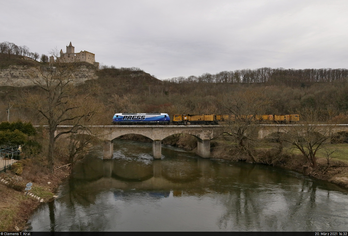 Unverhofft fährt 145 085-7 (145 030-7) mit einem Speno Schienenschleifzug unbekannten Typs in Saaleck über die Saale Richtung Naumburg(Saale)Hbf.