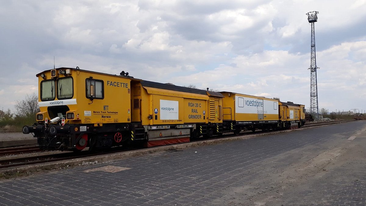 Die Fa. SCHWEERbau mit ihrer Plasser & Theurer Schienenschleifmaschine GWM 550 + LINSINGER Schienenfräszug SF 03 bei der Durchfahrt Bf. Flughafen Berlin-Schönefeld. Lothar Stöckmann