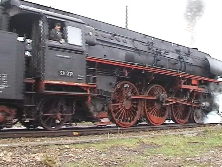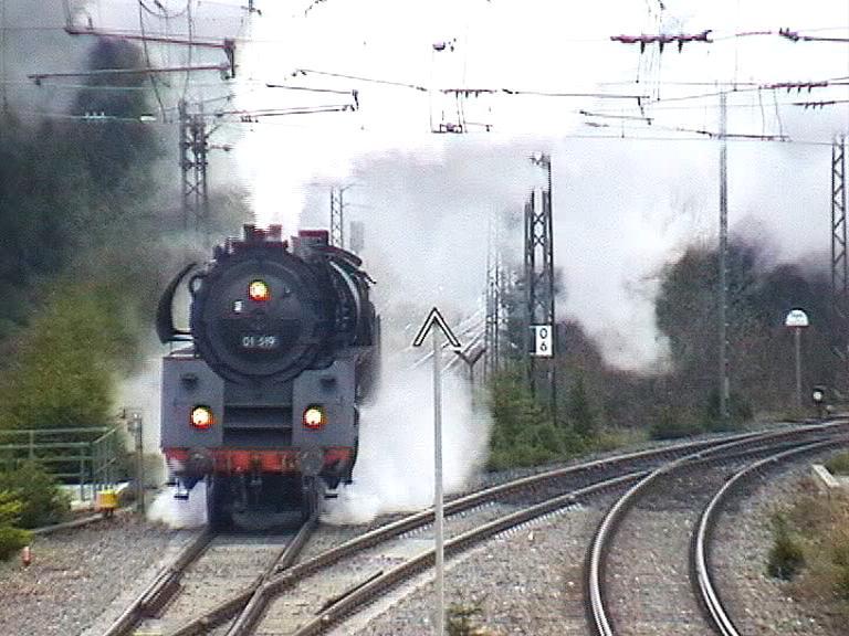 Es war eine der schönsten Sonderfahrten mit der 01 118. Grimmige minus 18Grad ab FfmHbf über Hanau, Fulda, Gießen, Limburg, Koblenz zurück nach Frankfurt/M. Klaus Mühleisen hatte auch hier wieder sein ganzes Können gezeigt, wenn bei eisglatten Schienen in Kurven wieder beschleunigt werden musste. Hier fährt 01 118 für eine Scheineinfahrt ein Stück zurück