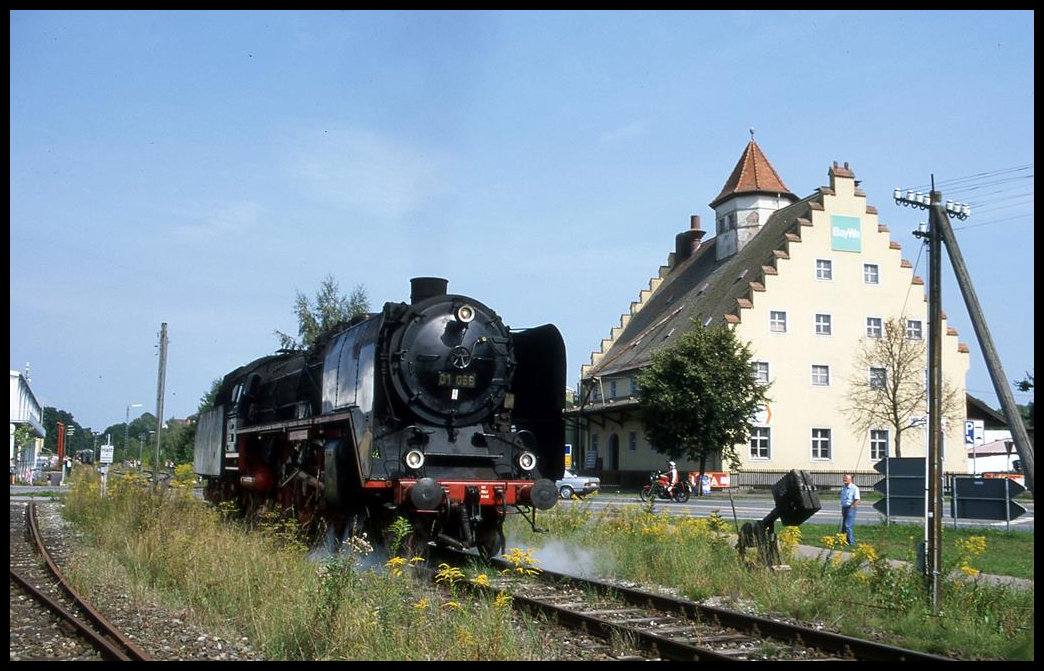 Dampflok 01066 ist am 25.08.2002 mit ihrem Personenzug aus Nördlingen angekommen und setzt hier für die Rückfahrt um.