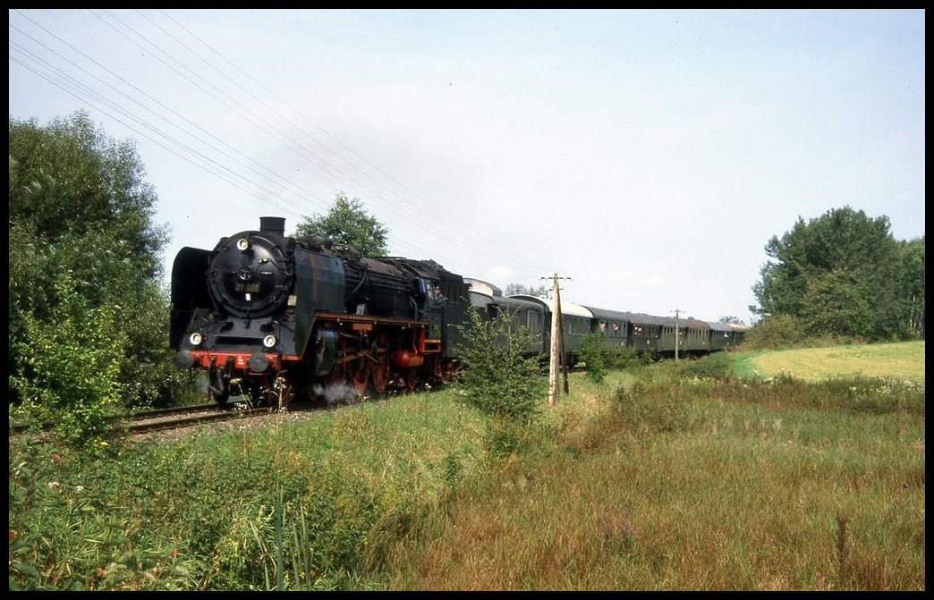 Dampflok 01066 des Museum BW Nördlingen hat hier mit ihrem Personenzug am 25.8.2002  Dinkelsbühl verlassen und fährt zurück nach Nördlingen.
