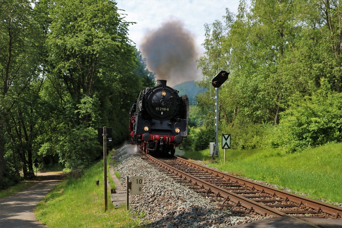 Historische Eisenbahn Frankfurt am Main 01 118 mit einen Sonderzug in Nidda Bhf am 27.04.19 von einen Gehweg aus fotografiert