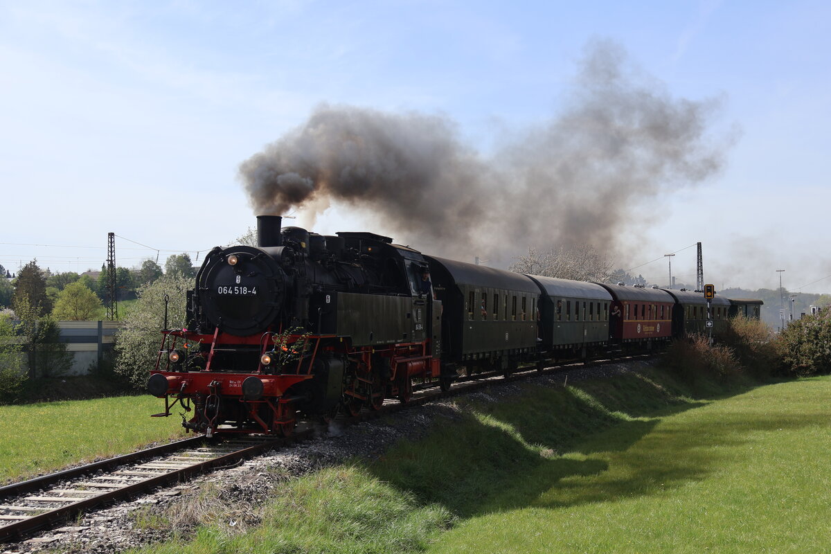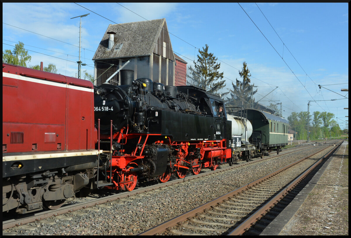 Nach dem Fahrtrichtungswechsel in Schweinfurt schiebt nun die kleine Dampflok 64 518 (Eurovapor) am 28.12.2024 bei der ersten Runde den GleisGlück-Sonderzug  Mit Volldampf um Würzburg  bei Waigolshausen nach. Währenddessen nahm die Dampflok 50 380 (MDV) in Schweinfurt Wasser. Danach fuhr die Maschine Lz und Tender voraus durchs Werntal zurück nach Gemünden, um die nächste Runde wieder zu bespannen.