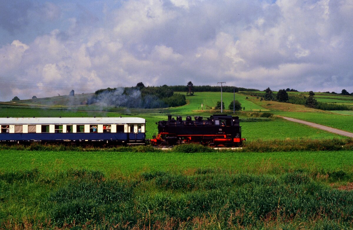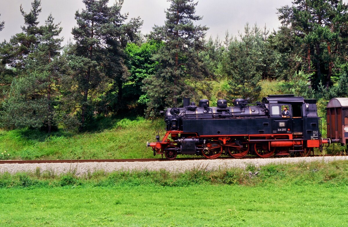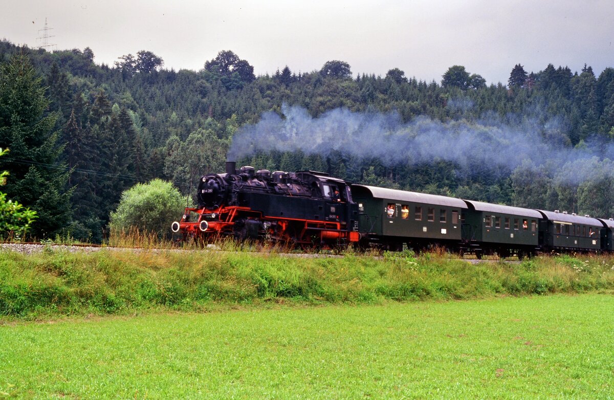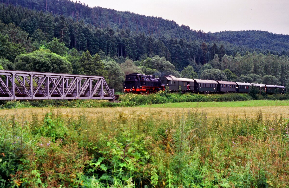Frühere DB-Dampflok 64 289 (EFZ) bei einer Sonderfahrt auf Gleisen der Hohenzollerischen Landesbahn in der Nähe des Bahnhofs Kleinengstingen. Der Zug befährt gleich die Hzl-Bahnstrecke Kleinengstingen-Gammertingen, auf der zu dieser Zeit keine fahrplanmäßigen Personenzüge verkehrten (22.07.1987)