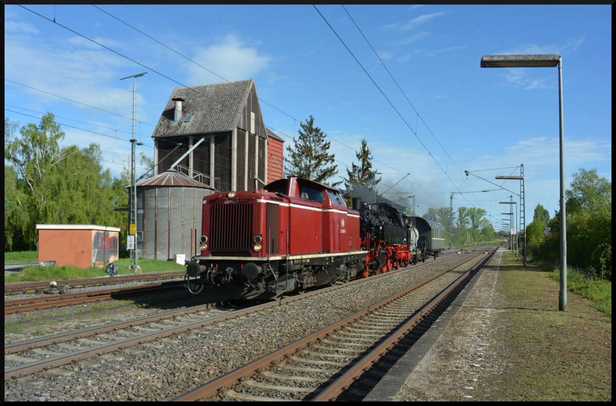 Leise säuselnd schleicht Dampflok 23 058 (Eurovapor) am 28.12.2024 bei der zweiten Runde mit dem GleisGlück-Sonderzug  Mit Volldampf um Würzburg  auf Gleis 1 in den Bahnhof Rottendorf auf ein  Halt  zeigendes Signal zu. Am Zugschluss hängt die 64 518 (ebenfalls Eurovapor). Der zwölf Wagen lange Zug wurde aus den Beständen von FME Nürnberg, MDV und Eurovapor gebildet.