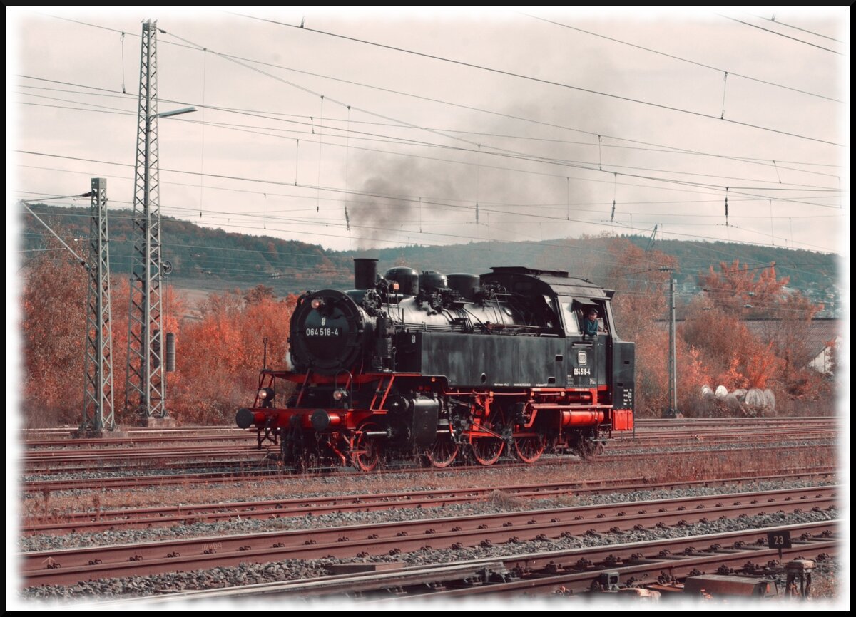 Die 1928 von Borsig gebaute 64 006 stand seit 1977 vor einem Restaurant als Denkmallok am Bf. Elmstein. Hier entstand 1981 die Aufnahme der mit ihrer EDV-Nummer 064 006 (ohne Prüfziffer 0) angeschriebenen Dampflok.