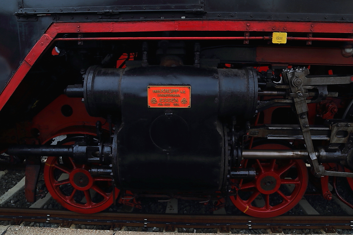 Dieses Bild zeigt den linken Arbeitszylinder von Dampflok 01 118, aufgenommen in Schweinfurt Hbf am 06.09.2014. Wie man sehen kann, ist nicht nur die ganze Lok, sondern auch das Herstellerschild derselben in einem ausgezeichneten Zustand!