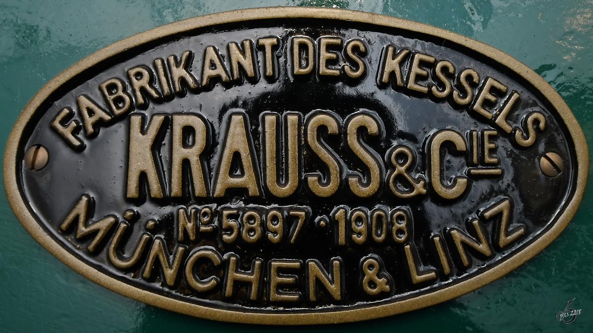Fabrikschild auf der Bayerischen PtL 2/2. (Eisenbahnmuseum Koblenz, August 2018)