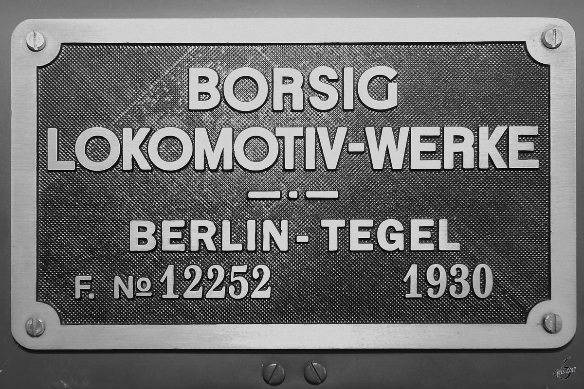 Herstellerschild der Stromlinien-Dampflokomotive 03 002. (Oldtimermuseum Prora. April 2019)