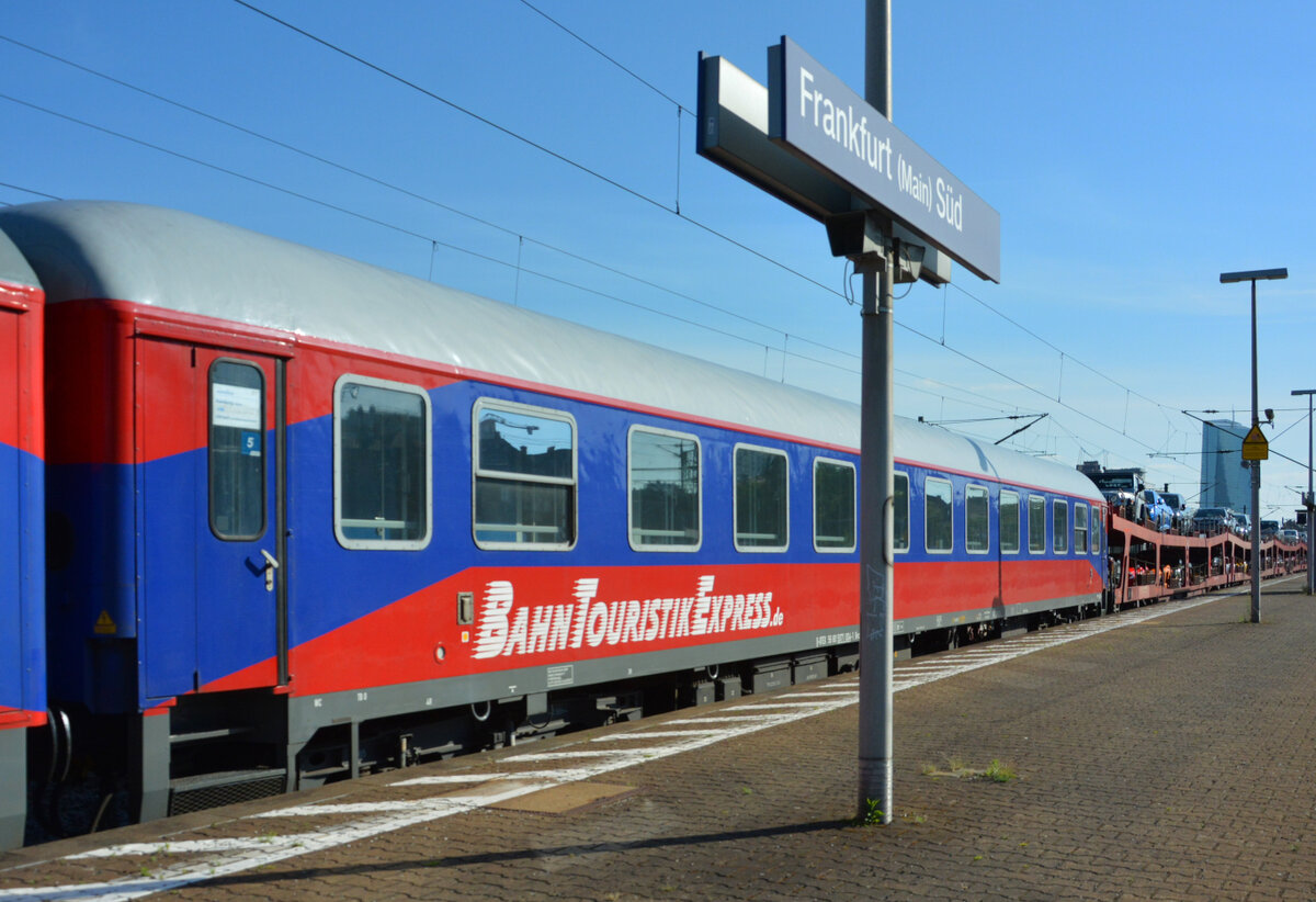 Der knapp drei Stunden verspätete und gut ausgelastete BTE AutoReiseZug (RDC 1310) mit dem ALPEN-SYLT Nachtexpress (RDC Deutschland, NEx 1818) gezogen von ÖBB Taurus 1016 041 am 22. Mai 2022 beim morgendlichen Halt in Frankfurt/Main Süd auf dem Weg von Westerland/Sylt & Hamburg-Altona nach Basel und Lörrach. Grund für die Verspätung war eine großräumige Umleitung über Altenbeken und fehlende Fahrplandaten durch DB Netze.