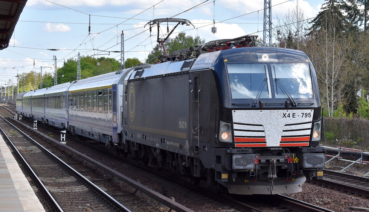 DB Fernverkehr AG [D] mit der BRCE Vectron "X4 E - 795" [NVR-Nummer: 91 80 6193 795-2 D-DISPO] und EC aus Polen Richtung Berliner Innenstadt am 27.04.24 Höhe Berlin Hirschgarten. Lothar Stöckmann