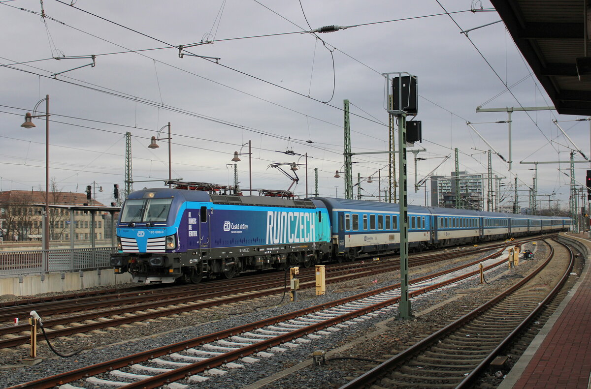ČD 193 688-9 "Majmir" / "RUNCZECH" (91 80 6193 688-9 D-RAILL) mit dem EC 378 "Berliner" von Praha hl.n. nach Kiel Hbf, am 14.02.2024 in Dresden Hbf. Frank Thomas