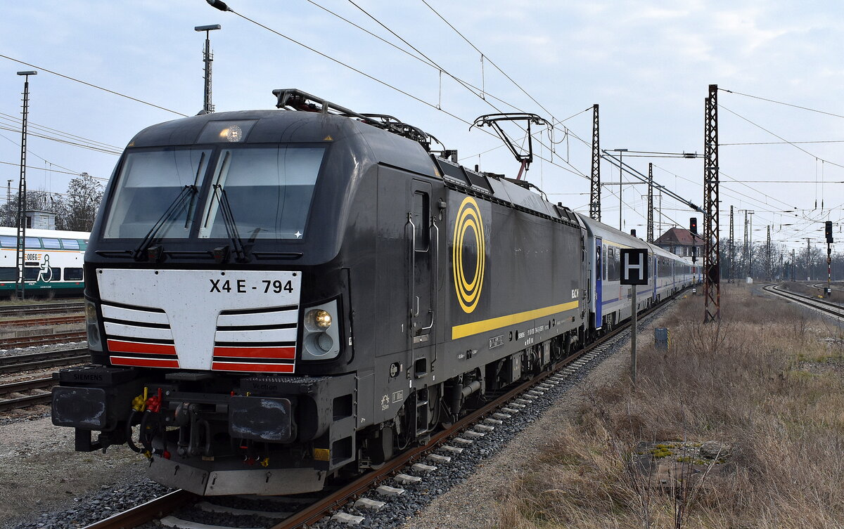 DB Fernverkehr AG [D] mit der neuen BRCE Vectron "X4 E - 794" [NVR-Nummer: 91 80 6193 794-5 D-DISPO] und EC aus Warschau (Polen) am 04.03.24 Einfahrt Bahnhof Frankfurt/Oder. Lothar Stöckmann