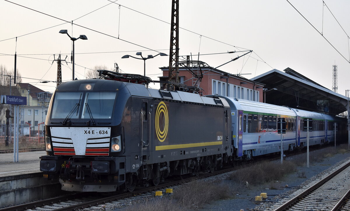 DB Fernverkehr AG [D] mit der BRCE Vectron "X4 E - 634" [NVR-Nummer: 91 80 6193 634-3 D-DISPO] und EC Richtung Warschau am 04.03.24 Ausfahrt Bahnhof Frankfurt/Oder. Lothar Stöckmann