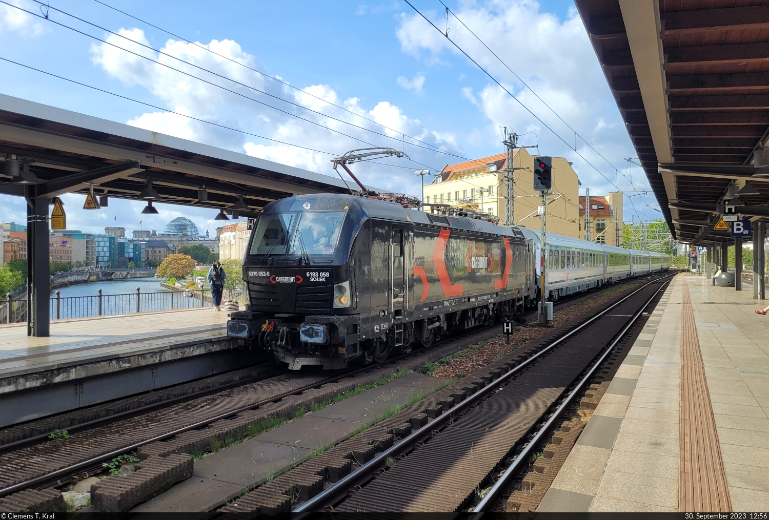 5370 052-0 (193 058 "Sołek" | 91 51 5370 052-0 PL-ID | Siemens Vectron) durchfährt den Bahnhof Berlin Friedrichstraße, mit Blick zum Bundestag an der Spree.