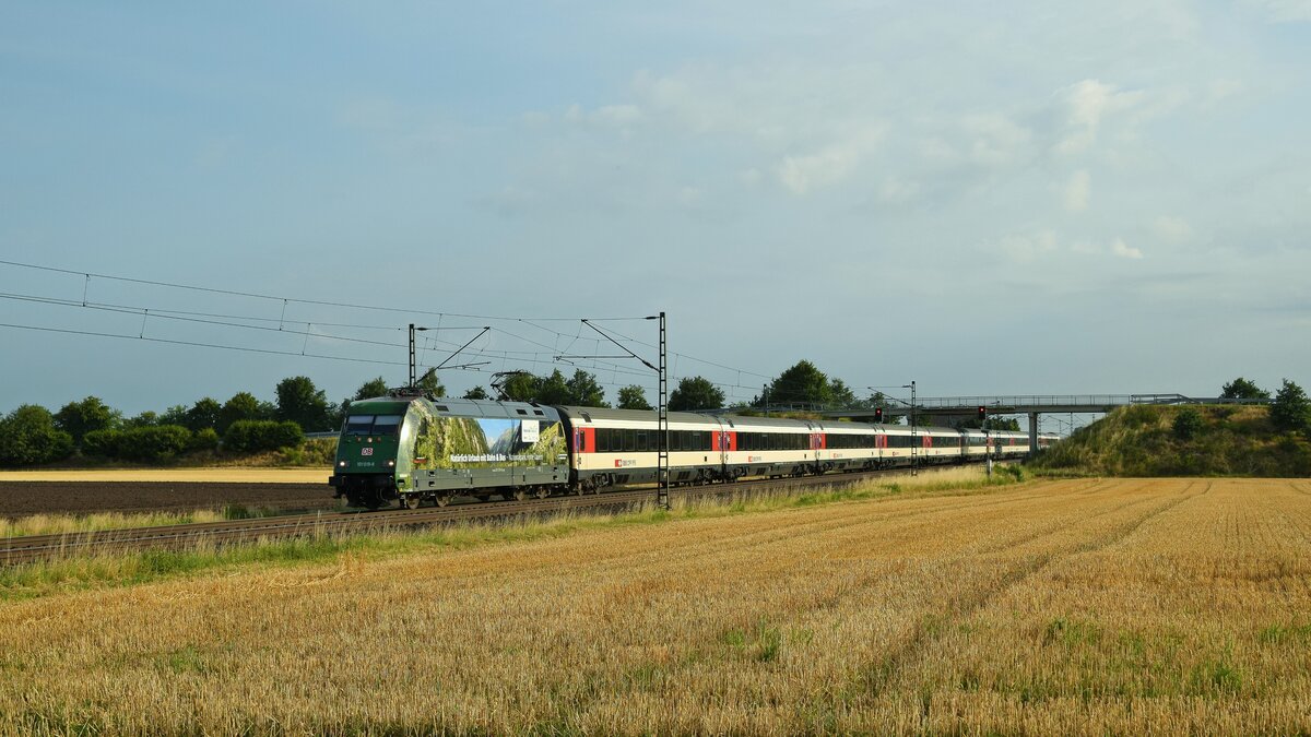 DB Fernverkehr 101 019-8 "Fahrtziel Natur Natürlich Urlaub mit Bahn&Bus" mit dem aus SBB-Wagen gebildeten EC 9 Hamburg-Altona - Zürich HB (Marl, NI, 14.07.2023). Die Lok wirbt auf beiden Längsseiten für unterschiedliche Reiseziele. Auf der hier sichtbaren Seite wirbt sie für einen Urlaub im Nationalpark Hohe Tauern, auf der gegenüberliegenden Seite für einen Urlaub im Nationalpark Sächsische Schweiz.