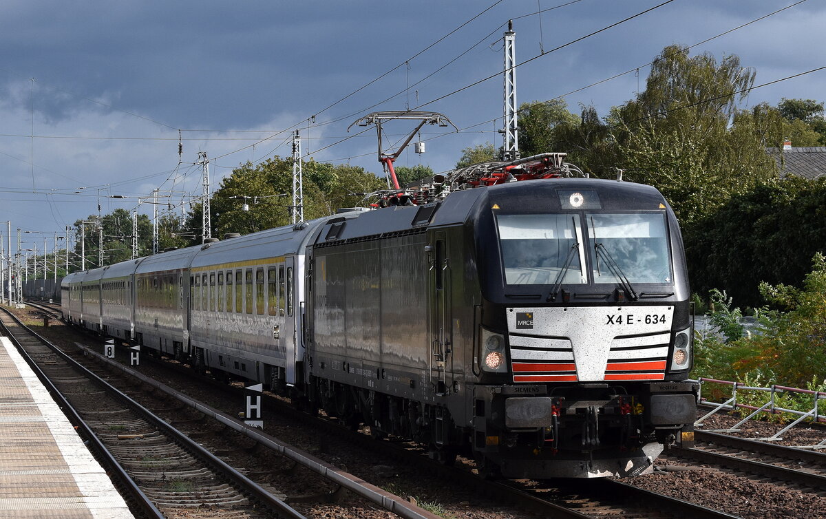 PKP Intercity spółka z o.o., Warszawa [PL] mit der recht neuen MRCE Vectron "X4 E - 634"[NVR-Nummer: 91 80 6193 634-3 D-DISPO] und dem EC 58 aus Gdynia Glowna (Polen) Richtung Berlin Hbf. am 04.10.23 Berlin Hirschgarten. Lothar Stöckmann