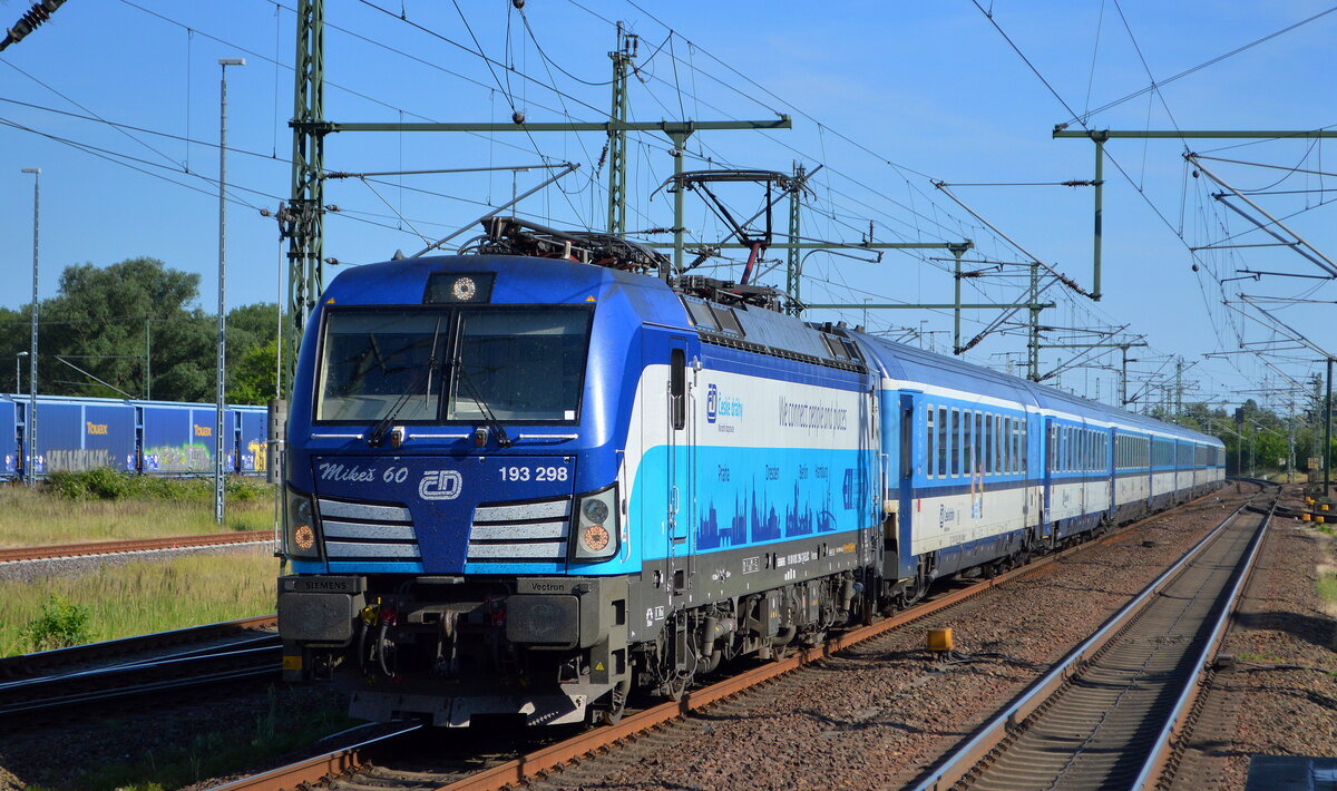 ČD - České dráhy a.s., Praha [CZ]mit der ELL Vectron "193 298" [Name: Mikes 60] [NVR-Nummer: 91 80 6193 298-7 D-ELOC] und EC Richtung Hamburg am 15.06.22 Einfahrt Bahnhof Wittenberge. Lothar Stöckmann