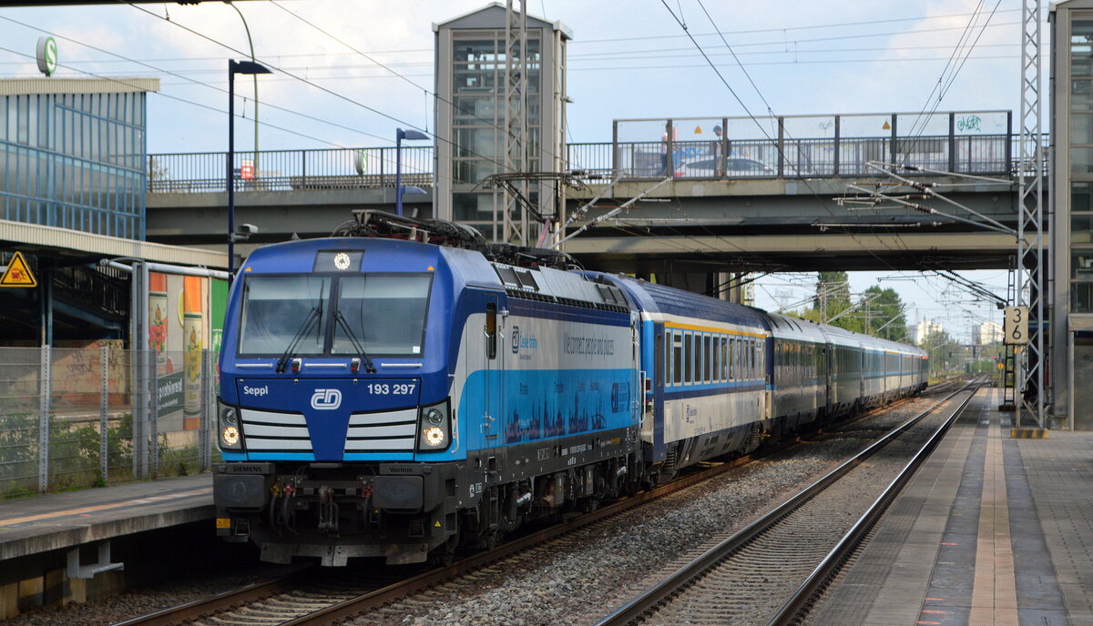 ČD - České dráhy a.s., Praha [CZ] mit der angemieteten "193 297" [Name: Seppl][NVR-Nummer: 91 80 6193 297-9 D-ELOC] und umleitungsbedingt (Bahnbaustellen) mit EC Richtung Hamburg am 17.08.22 Durchfahrt Bahnhof Berlin Hohenschönhausen. Lothar Stöckmann