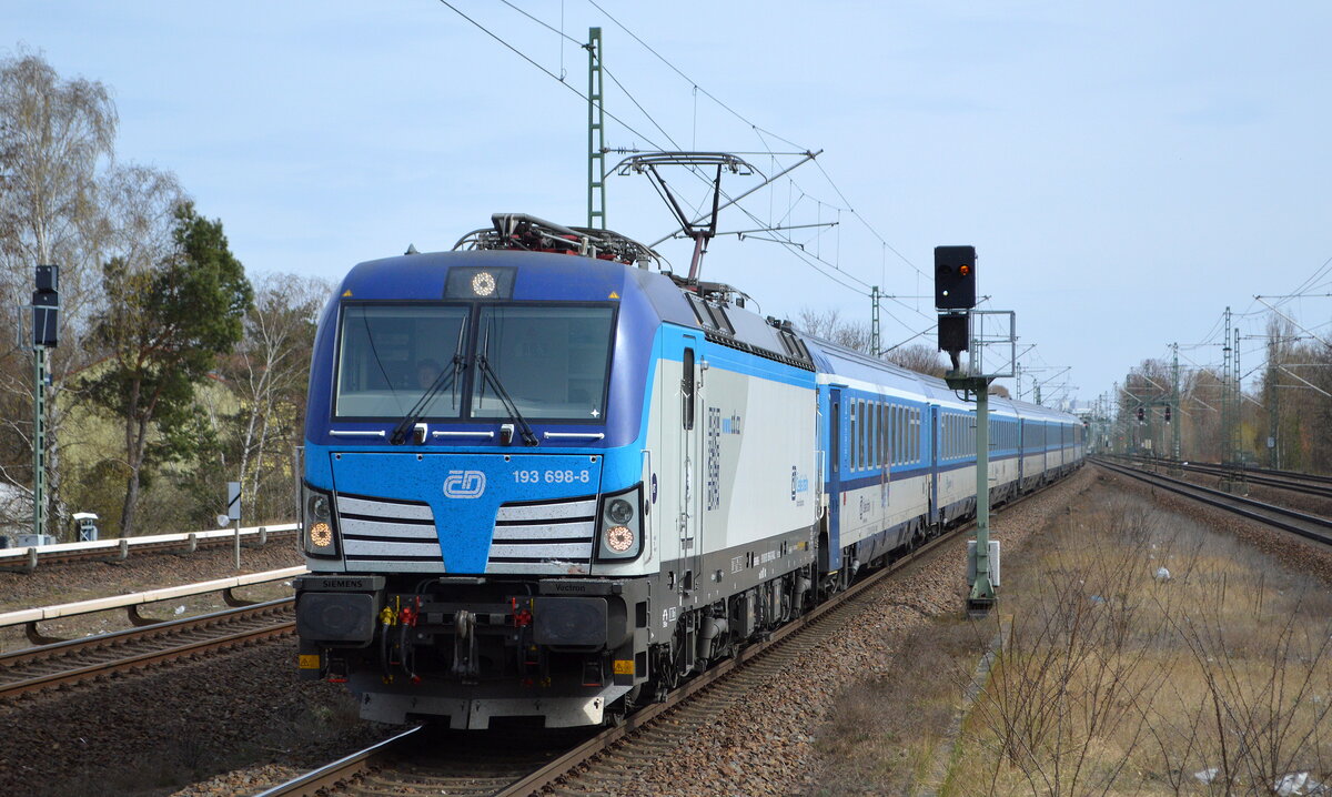 EC 175 nach Praha hl.n. mit ČD - České dráhy a.s., Praha [CZ] "193 698-8" [NVR-Nummer: 91 80 6193 698-8 D-RAILL] am 01.04.22 Durchfahrt Bf. Berlin-Jungfernheide Richtung Spandau. Lothar Stöckmann