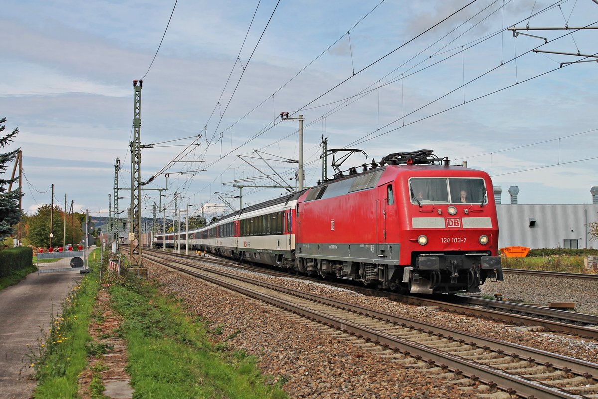 Am 07.10.2017 bespannte die 120 103-7 außerplanmäßig für eine ausgefallene 101er den EC 7 (Hamburg Altona - Interlaken Ost) vom Startbahnhof bis Basel SBB, als sie bei Eimeldingen aus Rcihtung Katzenbergtunnel sich in die alte Rheintalstrecke einfädelte und gen Schweizer Grenze fuhr. Tobias Schmidt