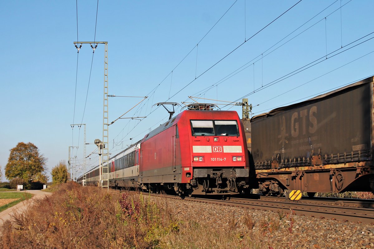 Am Nachmittag des 31.10.2017 fuhr 101 114-7 mit dem EC 9 (Hamburg Altona - Zürich HB) nördlich von Müllheim (Baden) durchs Rheintal in Richtung Schweizer Grenze. Tobias Schmidt
