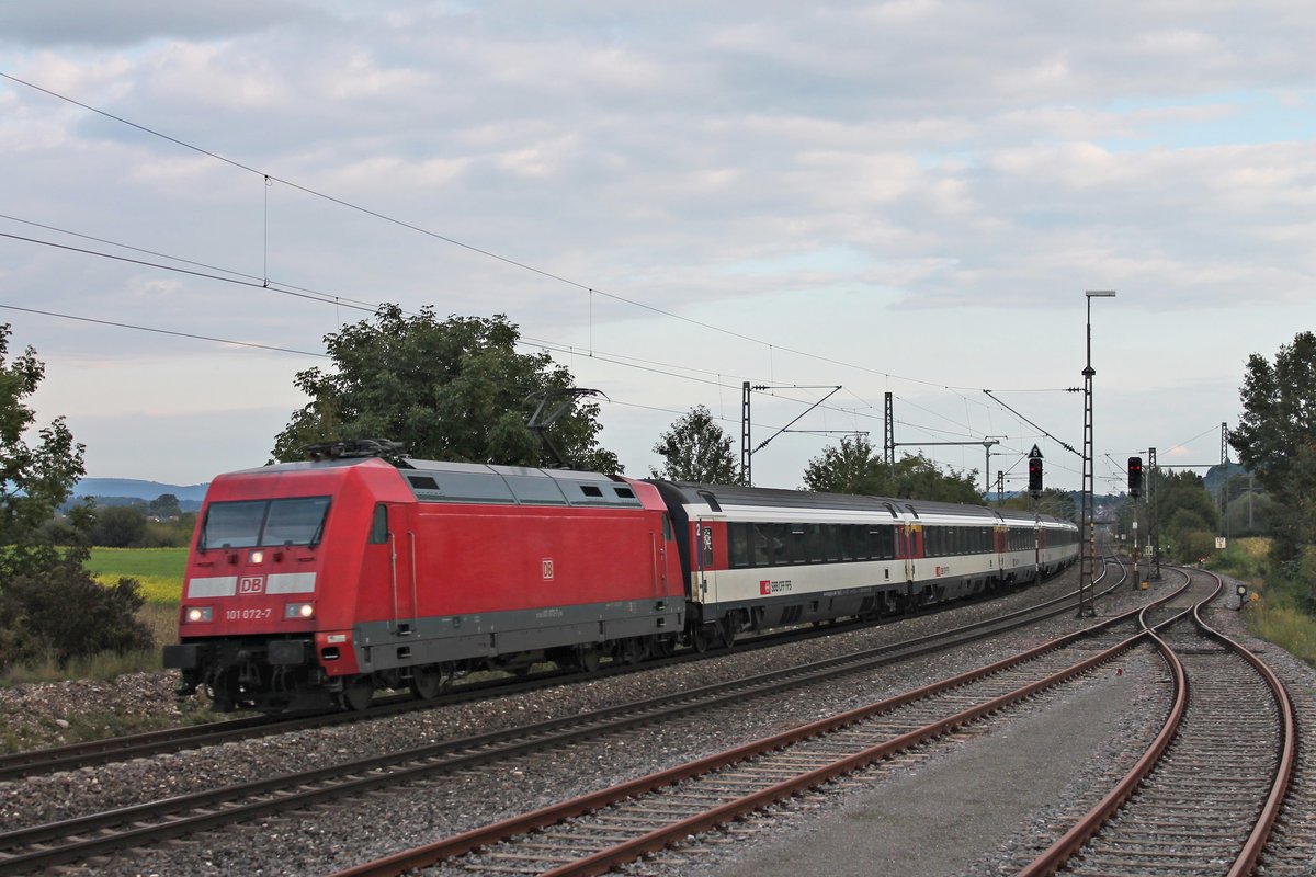 Mit einem IC (Stuttgart Hbf - Zürich HB) fuhr am Abend des 20.09.2017 die 101 024-8 durch Welschingen-Neuhausen in Richtung Singen (Hohentwiel), wo sie ihren Zug dann an eine SBB Re 4/4 II übergibt. Tobias Schmidt