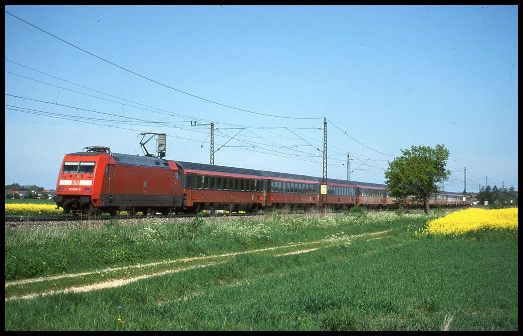 101056 ist hier mit einem Eurocity aus Wien am 9.5.2002 um 15.03 Uhr bei Neu Ulm in Richtung Stuttgart unterwegs.