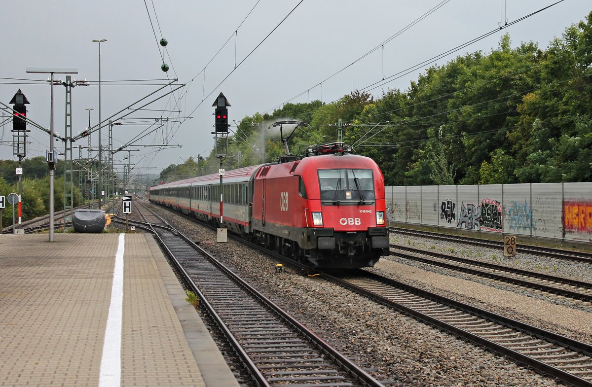 Durchfahrt von 1016 042 am 12.09.2017 bei Regen mit dem EC 112 (Klagenfurt Hbf - Frankfurt (Main) Hbf) und der 1116 138 am Zugschluss in Zorneding gen München Ost.