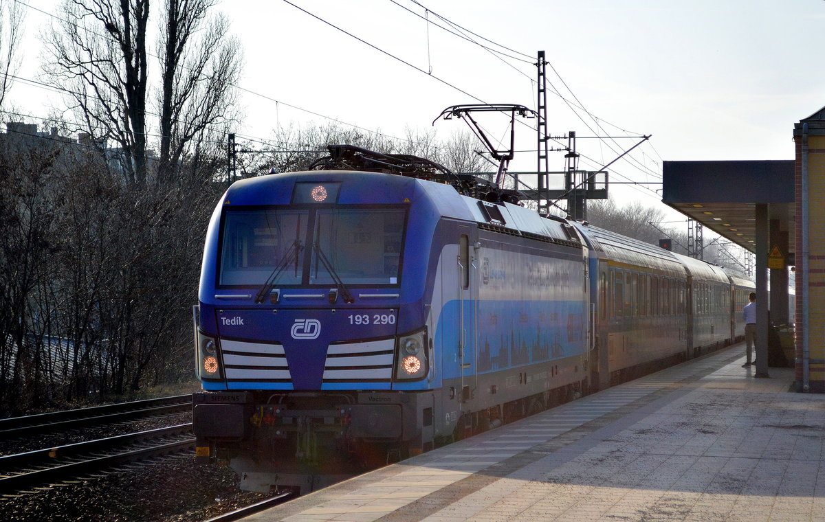 EC 174 aus Prag mit der ELL Vectron von ČD - České dráhy a.s.  193 290  [Name: Tedik] [NVR-Number: 91 80 6193 290-4 D-ELOC] Richtung Berlin Hbf (tief) am 25.02.19 Durchfahrt Bf. Berlin-Jungfernheide.